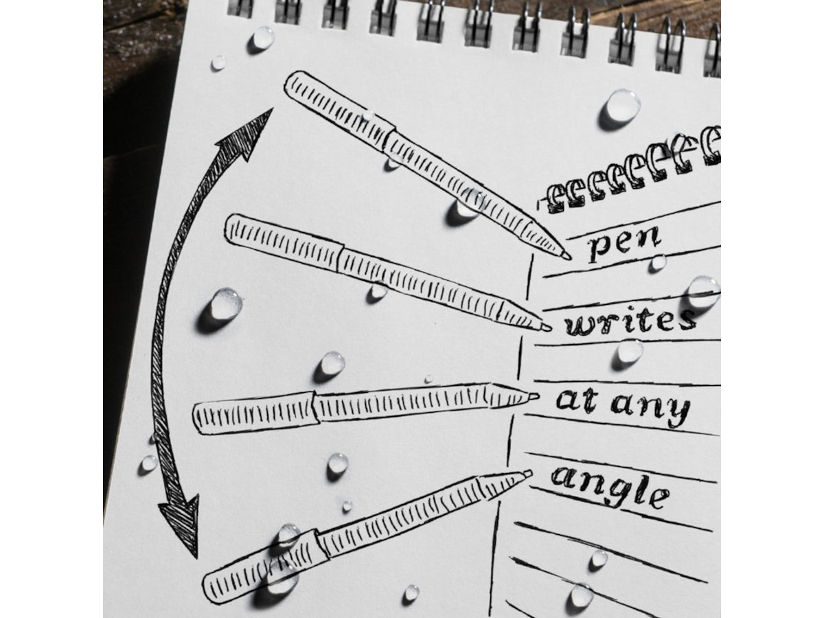 Writes Upside Down: Pressurized ink cartridge performs in temperatures from -30F to 250F, under water (up to 35 ft), and at any angle.