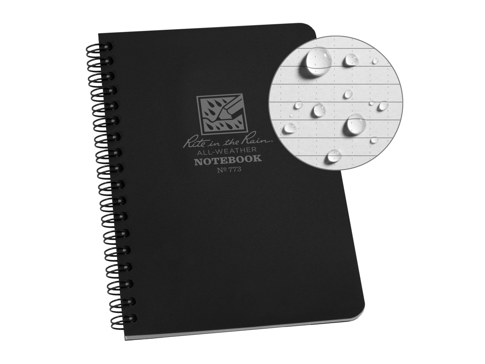 The black 4.625" X 7” side spiral notebook is fully prepared for any challenge mother nature throws at it. This book comes in a compact but comfortable size for taking plenty of notes, and our rite in the rain all-weather paper can handle any weather encounter in the field. Impact-resistant wire-o binding won't lose its shape in your back pocket and a Polyuria cover defends your notes from scratches and stains. The notebook comes equipped with 64 pages / 32 sheets. The non-glare gray paper is legible in bright sunlight. The universal page pattern is printed on the sheets in gray ink on gray 32# rite in the rain paper. Rite in the rain all-weather writing products have been made in Tacoma, Washington, USA since 1916. Recycle rite in the rain paper with standard papers. Recycle the entire notebook using most curbside programs (paper, plastic, & metal).