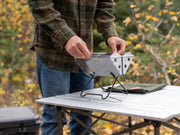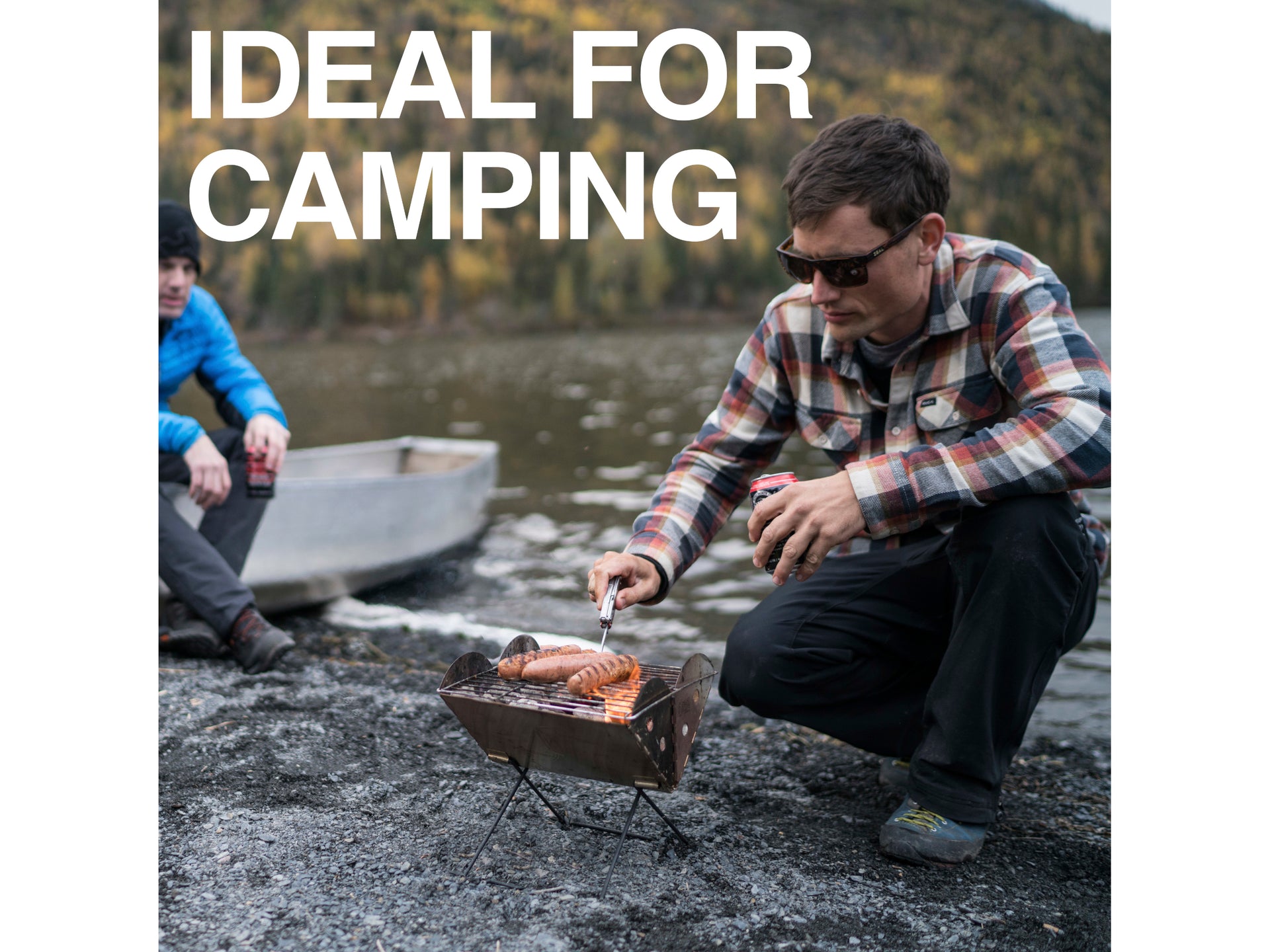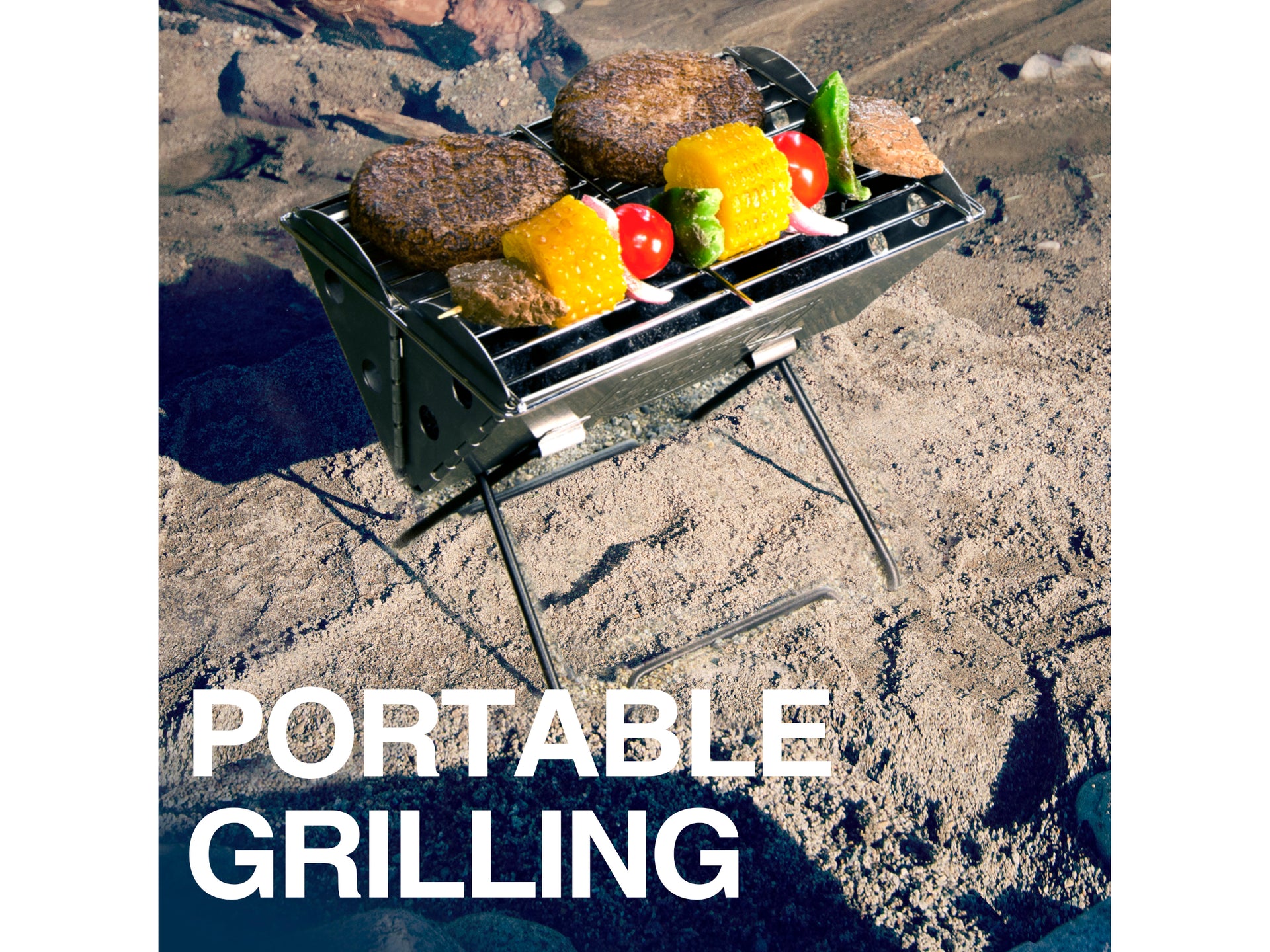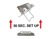 The Mini Flatpack portable grill & firepit serves 2-3 people and packs compact for easy transportation to the beach, campsite or barbeque. It is Stainless steel construction for durability and easy maintenance. It has a quick 30 second set-up and you are ready to go. All you need to do to set up this grill is unfold it and place the grates on top. Has a stable base for safe grilling. The sides of grill serve as wind break for grilling in windy conditions and it can be used as a firepit to help leave no trace when you are done. Dishwasher safe.