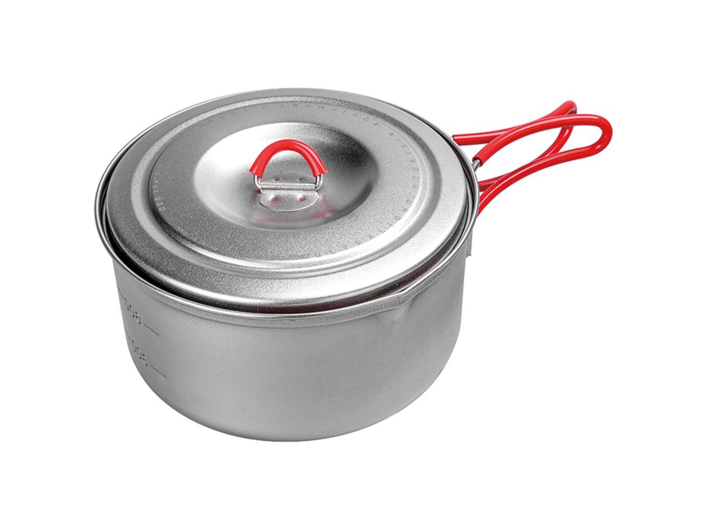 A flat pot with a large surface for catching flames.the thinness of 0.3mm can transfer the heat of stove inside high efficiency. Can store a 110 size gas canister, a small stove and can boil enough water for two cup noodles.It's large enough to easily cook one bag of instant noodles.