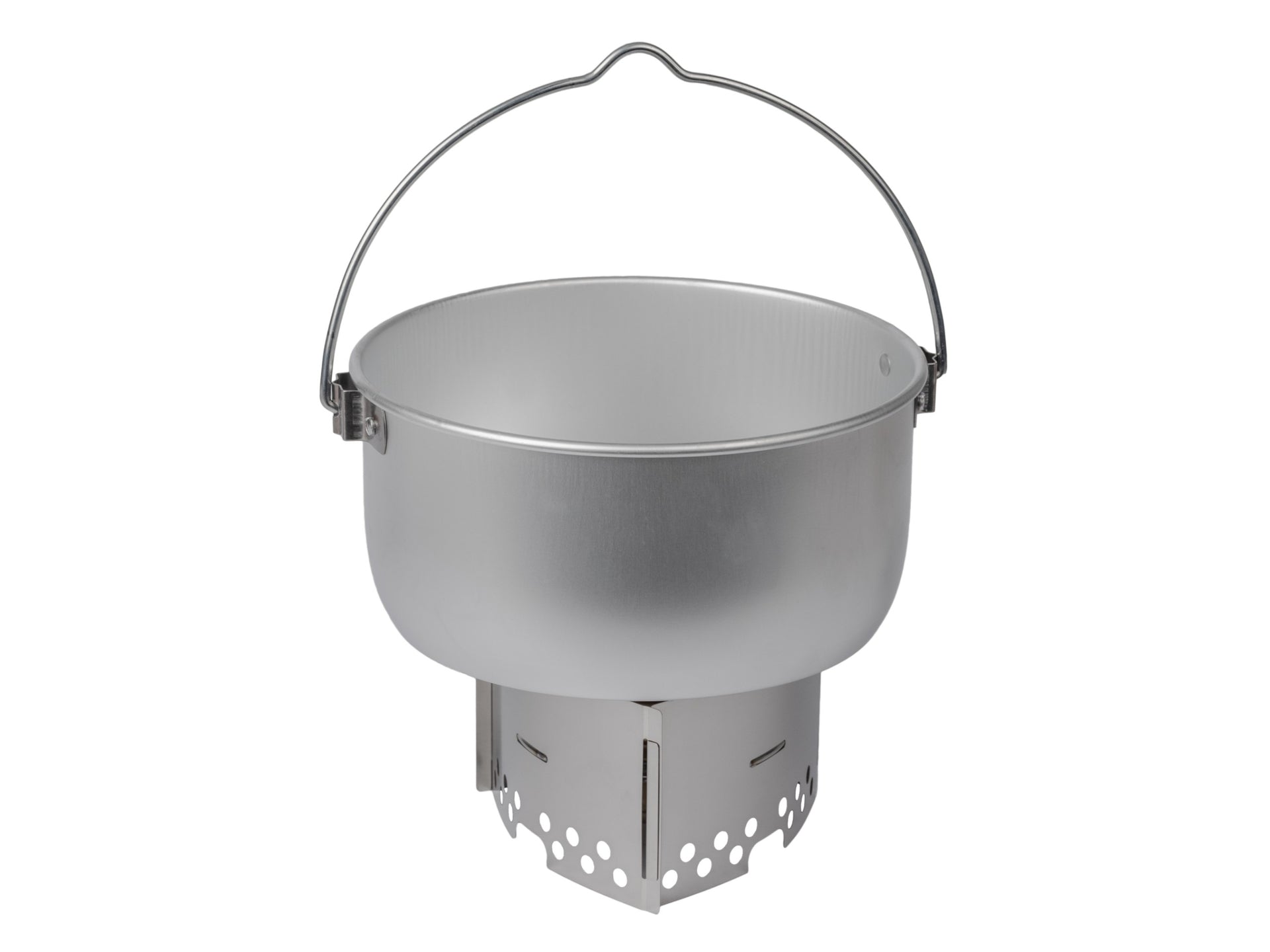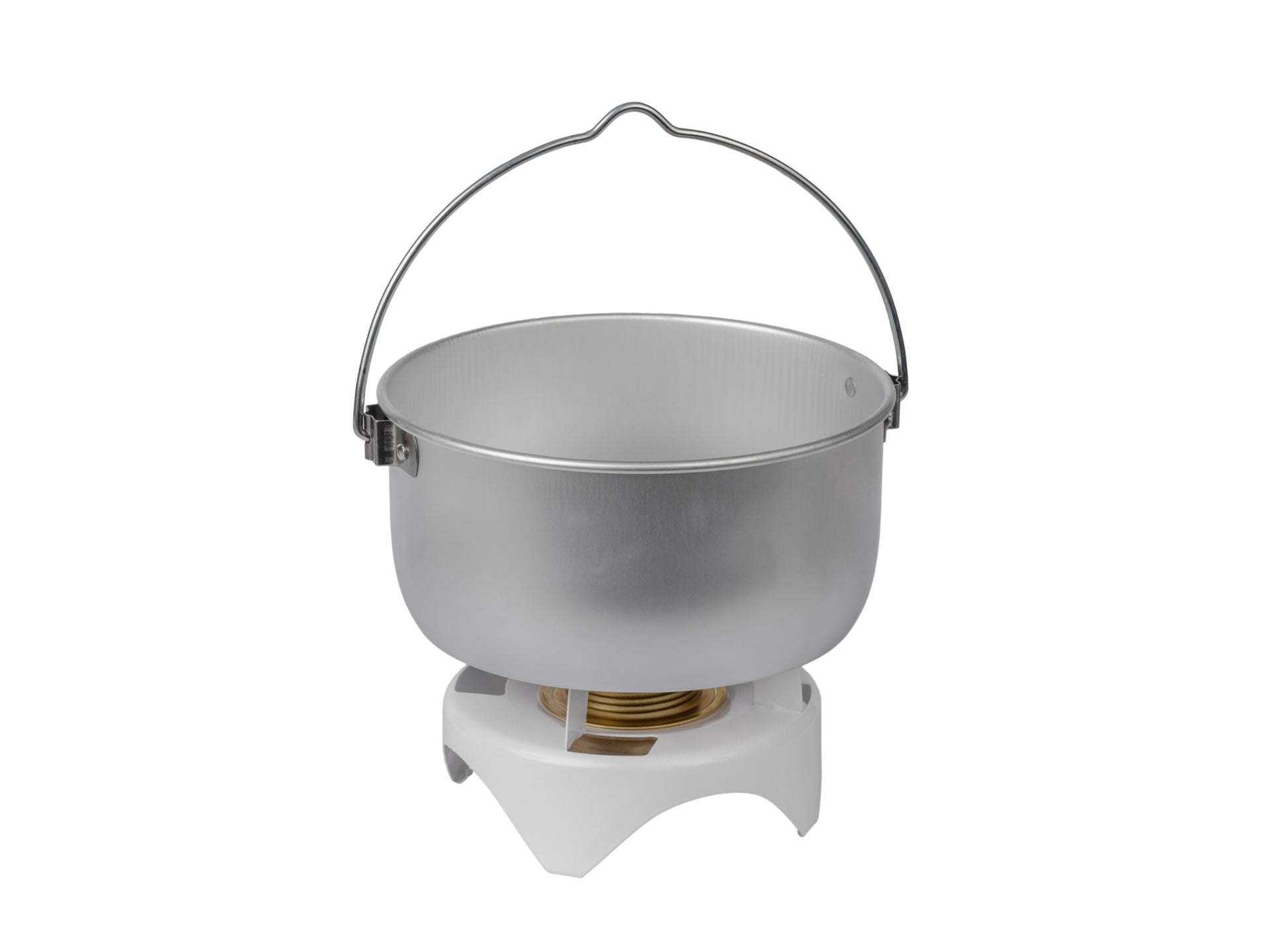 Billy 2.5 L in aluminium with lid and wire handle. Fits Trangia stoves 27 Small. Use on the stove with the supports in raised position,Like for a frypan. The whole stove can be packed into the billy. Can also be used on other heat sources.