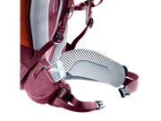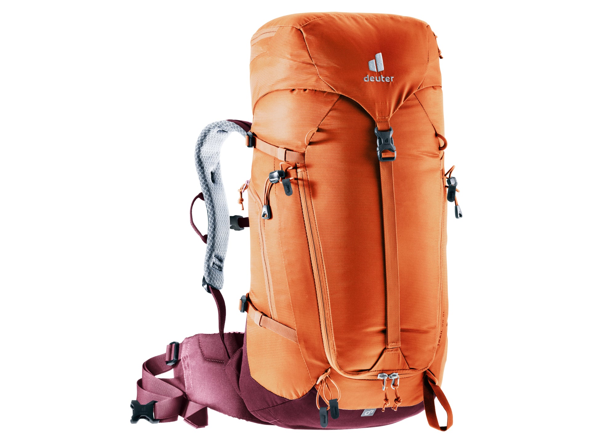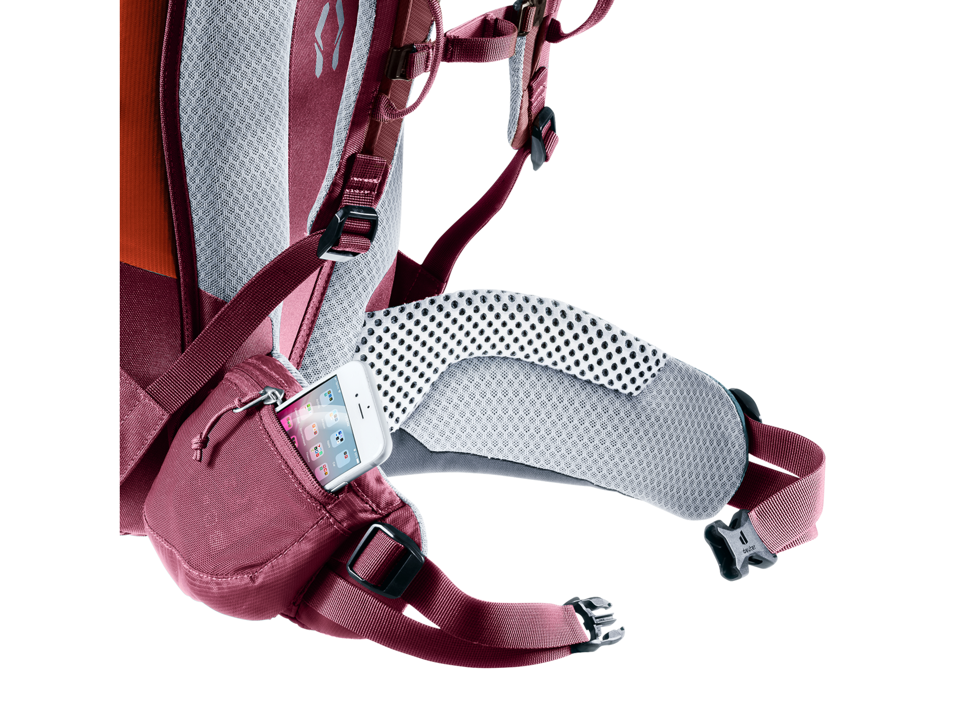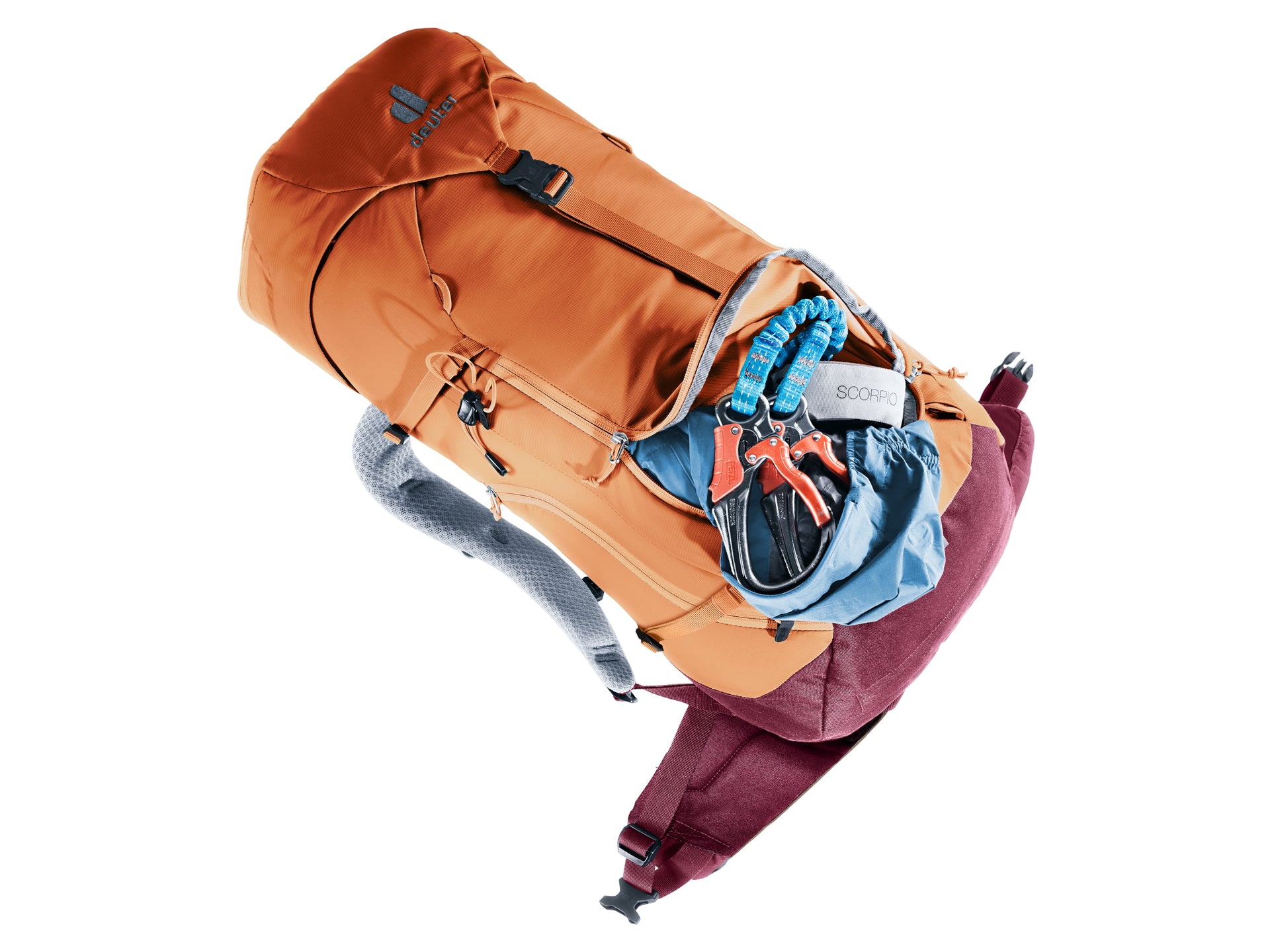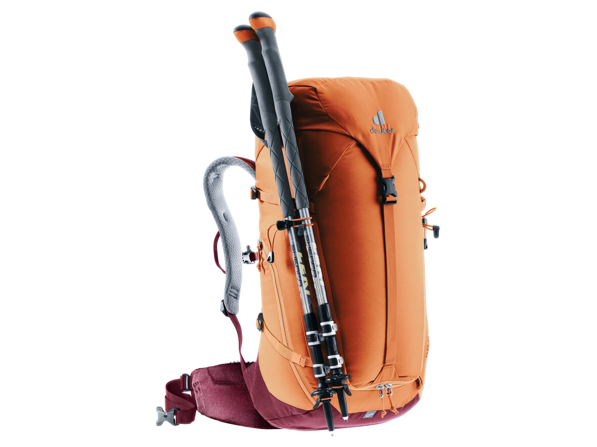 The reduced contact surface and large ventilation channels of the Deuter Airstripes back system combined with perforated shoulder straps and hip fins ensure maximum airflow and even weight distribution – for a snug, secure fit over any terrain. The flat-format lid allows space for the head to move, even with a helmet on. Loops on the shoulder straps keep via ferrata set carabiners close at hand. And thanks to a large front zipper opening and side pockets, equipment and gear are always easy to access.