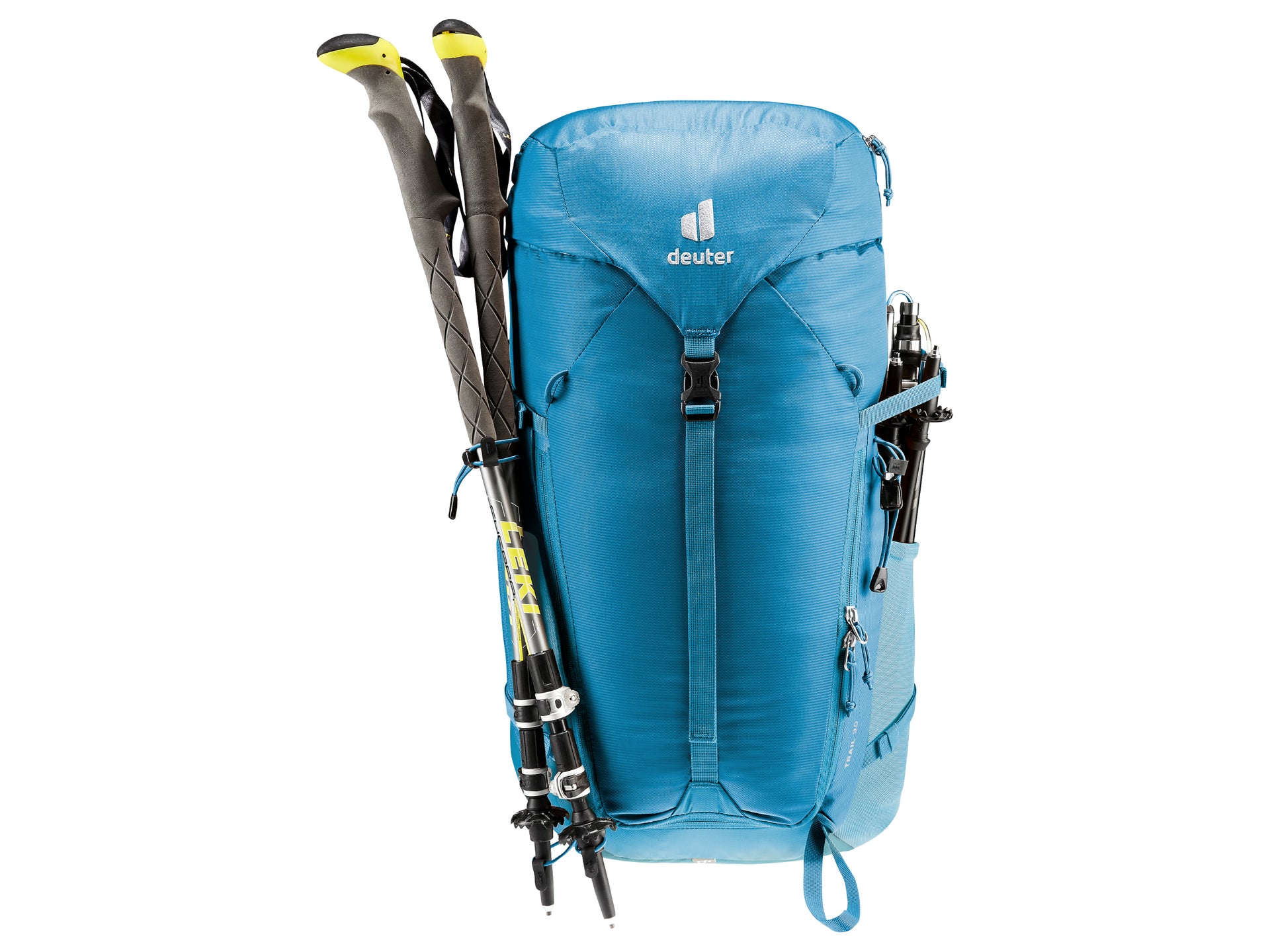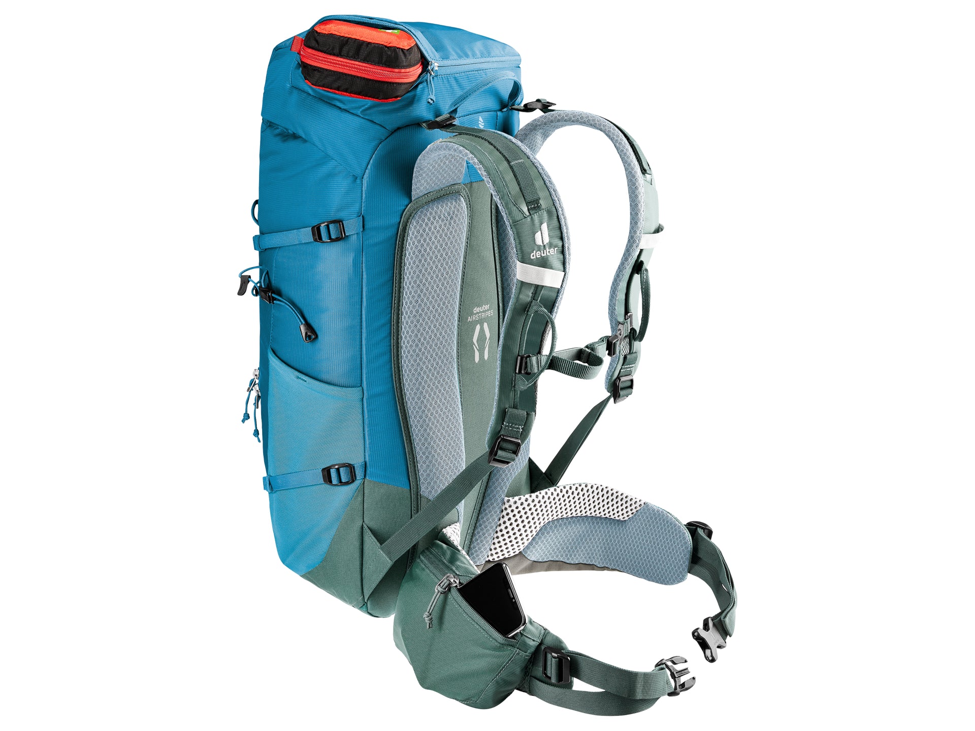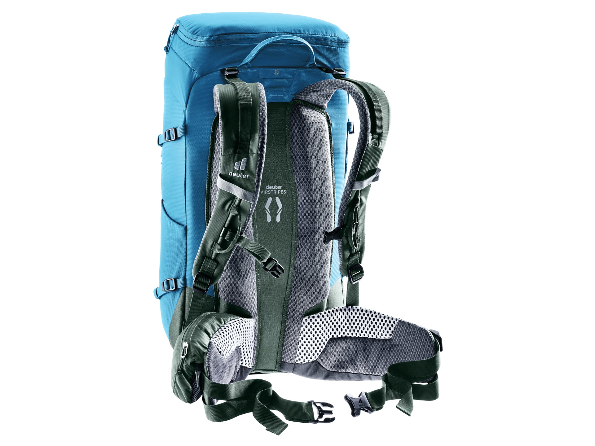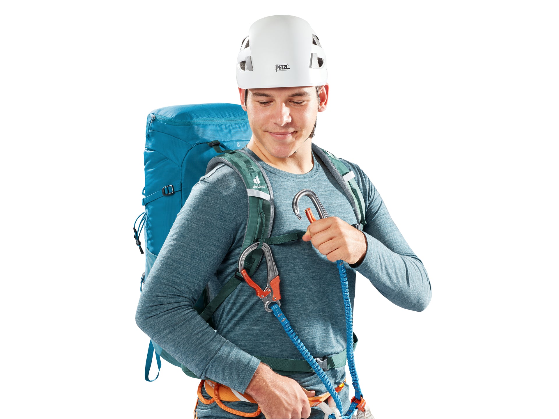 The reduced contact surface and large ventilation channels of the deuter Airstripes back system combined with perforated shoulder straps and hip fins (with pockets) ensure maximum airflow and even weight distribution – for a snug, secure fit over any terrain. The flat-format lid allows space for the head to move, even with a helmet on. Loops on the shoulder straps keep via ferrata set carabiners close at hand. And thanks to a large front zipper opening and side pockets, equipment and gear are always easy to access.