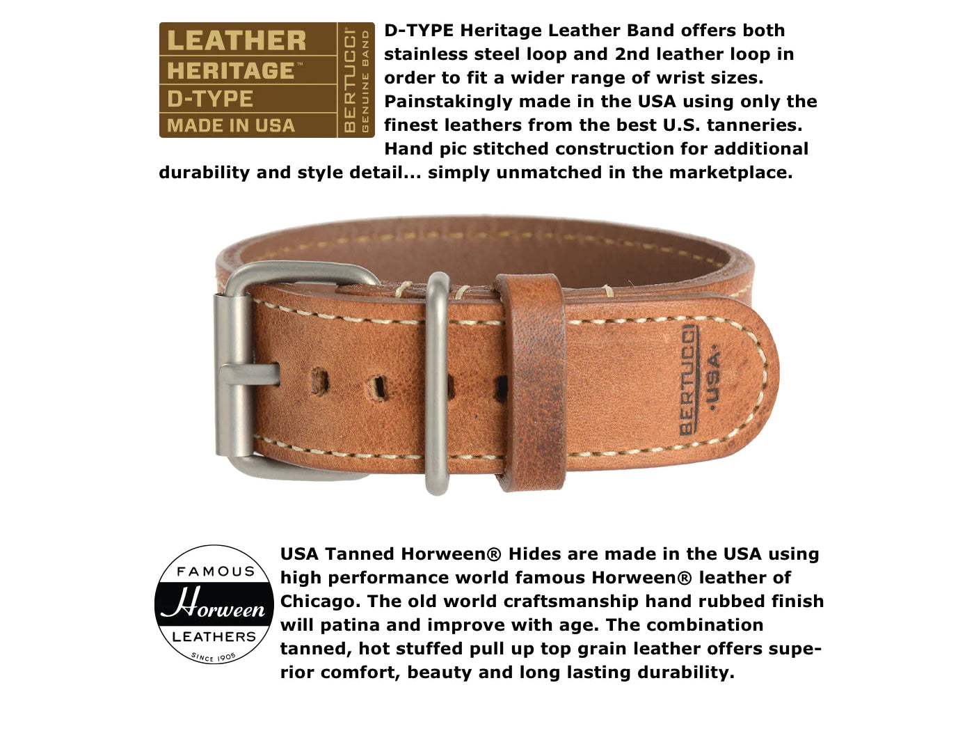•D-TYPE Heritage™ Leather Band offers both stainless steel loop and 2nd leather loop in order to fit a wider range of wrist sizes. Painstakingly made in the USA using only the finest leathers from the best U.S. tanneries. Hand pic stitched construction for additional durability and style detail... simply unmatched in the marketplace. Made in the USA.