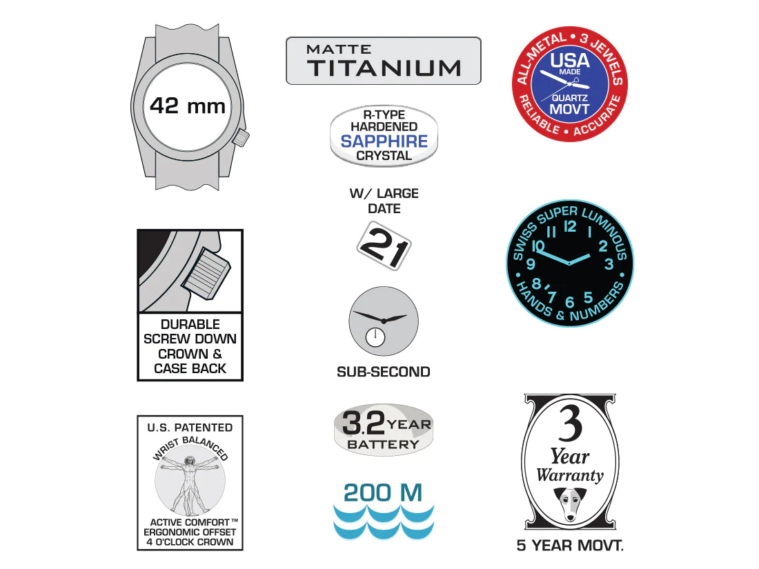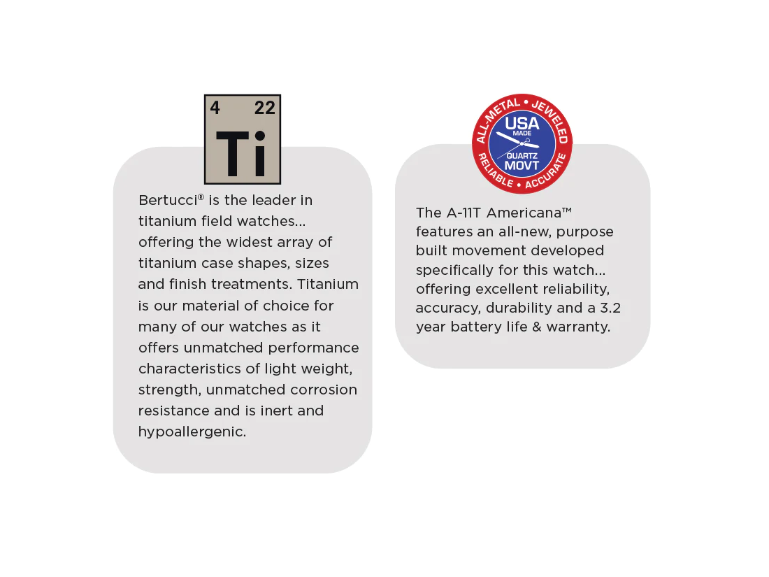The A-11T Americana™ was inspired by vintage U.S. Military issued watches. Painstakingly blending authentic details with our rugged U.S. Patented 42 mm titanium A-3T Unibody™ case. The result is a high performance, but yet classic field watch design that can only come from the leader in titanium field watches.