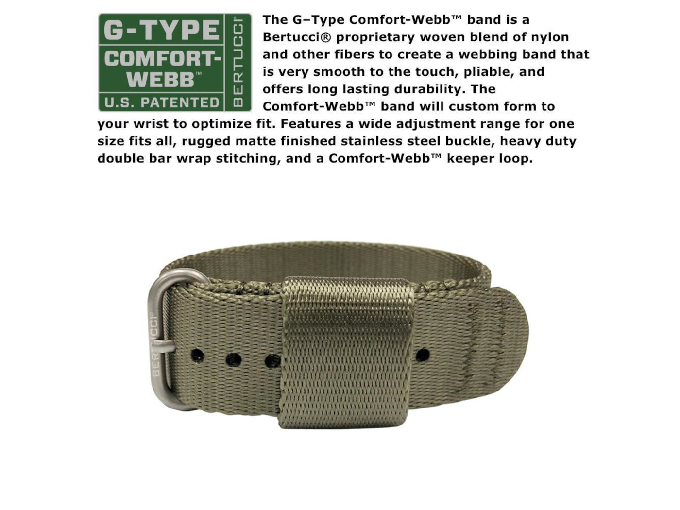 - The G–Type Comfort-Webb™ band is a Bertucci® proprietary woven blend of nylon and other fibers to create a webbing band that is very smooth to the touch, pliable, and offers long lasting durability. The Comfort-Webb™ band will custom form to your wrist to optimize fit and comfort. Features a wide adjustment range for one size fits all, rugged matte finished stainless steel buckle, heavy duty double bar wrap stitching, and a Comfort-Webb™ keeper loop