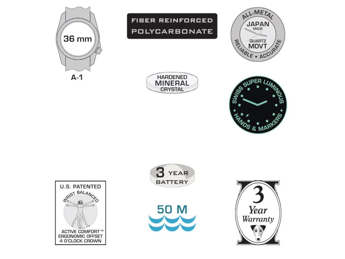The A-1R Field Comfort™ was developed for light weight comfort in a traditionally sized 36 mm case... weighing an amazing 1.16 oz. / 33 grams. The core of the design is a rugged U.S. Patented fiber reinforced Unibody™ case and an ultra-smooth Comfort-Webb™ band. Additionally, a 3 year battery, ergonomic off set crown, 50 M water resistance, scratch resistance R-Type mineral crystal, and precision movement. A watch that will last, and one that you won’t even know you’re wearing.