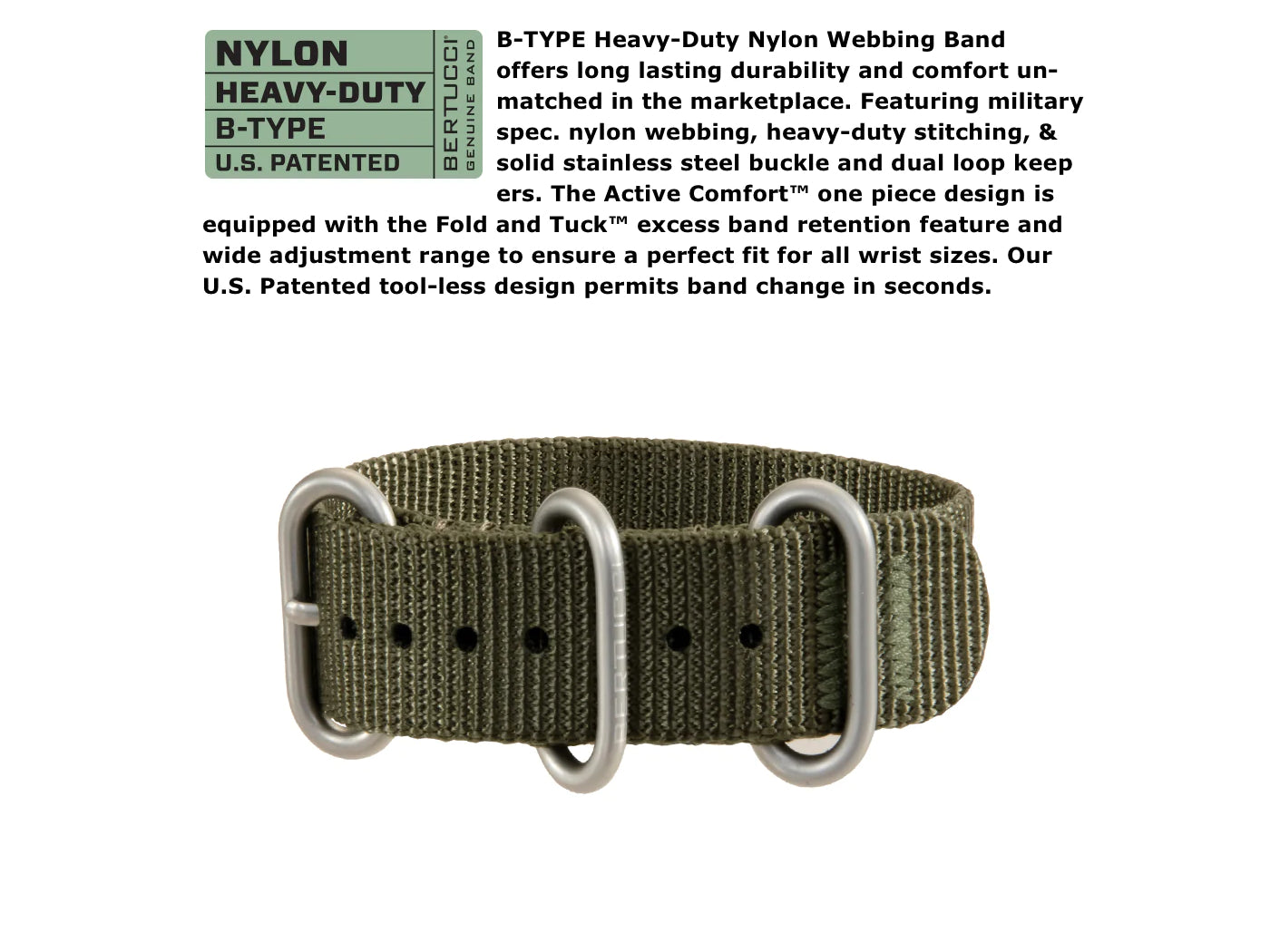 - B-TYPE Heavy-Duty Nylon Webbing Band offers long lasting durability and comfort unmatched in the marketplace. Featuring military spec. nylon webbing, heavy-duty stitching, and solid stainless steel buckle and dual loop keepers. The Active Comfort™ one piece design is equipped with the Fold and Tuck™ excess band retention feature and wide adjustment range to ensure a perfect fit for all wrist sizes.