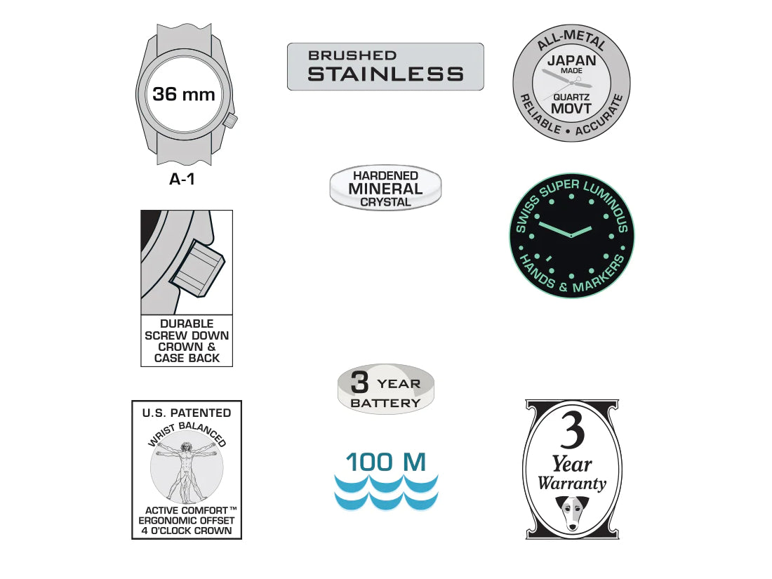 The A-1S Field™ features a traditionally sized 36 mm brushed stainless steel case. A true classic based on its essential function, clean easy to read dial design, value and long lasting durability. Equipped with rugged screw down crown & case back, 100 M water resistance, durable Unibody™ case, long lasting B-Type nylon band, R-Type mineral crystal, precision movement, Swiss super luminous hand & markers and 4 year battery.
