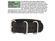- B-TYPE Heavy-Duty Nylon Webbing Band offers long lasting durability and comfort unmatched in the marketplace. Featuring military spec. nylon webbing, heavy-duty stitching, and solid stainless steel buckle and dual loop keepers. The Active Comfort™ one piece design is equipped with the Fold and Tuck™ excess band retention feature and wide adjustment range to ensure a perfect fit for all wrist sizes.