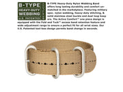 - B-TYPE Heavy-Duty Nylon Webbing Band offers long lasting durability and comfort unmatched in the marketplace. Featuring military spec. nylon webbing, heavy-duty stitching, and solid stainless steel buckle and dual loop keepers. The Active Comfort™ one piece design is equipped with the Fold and Tuck™ excess band retention feature and wide adjustment range to ensure a perfect fit for all wrist sizes.