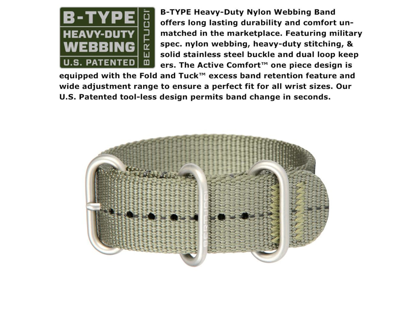 - B-TYPE Heavy-Duty Nylon Webbing Band offers long lasting durability and comfort unmatched in the marketplace. Featuring military spec. nylon webbing, heavy-duty stitching, and solid stainless steel buckle and dual loop keepers. The Active Comfort™ one piece design is equipped with the Fold and Tuck™ excess band retention feature and wide adjustment range to ensure a perfect fit for all wrist sizes.