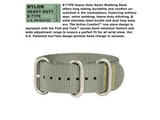 - B-TYPE Heavy-Duty Nylon Webbing Band offers long lasting durability and comfort unmatched in the marketplace. Featuring military spec. nylon webbing, heavy-duty stitching, and solid stainless steel buckle and dual loop keepers. The Active Comfort™ one piece design is equipped with the Fold and Tuck™ excess band retention feature and wide adjustment range to ensure a perfect fit for all wrist sizes.