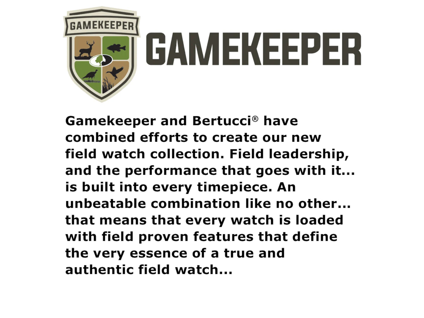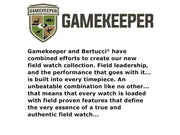 Gamekeeper™ and Bertucci® have combined efforts to create a new field watch collection. Field leadership, and the performance that goes with it... is built into every timepiece. An unbeatable combination like no other... that means that every watch is loaded with field proven features that define the very essence of a true and authentic field watch.