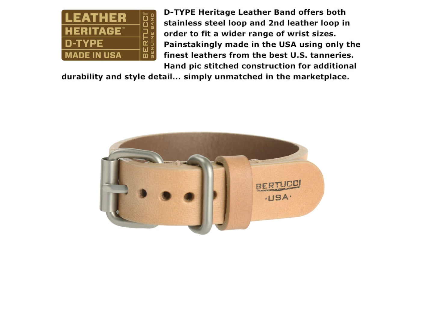 - D-TYPE Heritage Leather Band offers both stainless steel loop and 2nd leather loop in order to fit a wider range of wrist sizes. Painstakingly made in the USA using only the finest leathers from the best U.S. tanneries. Pic stitched construction for additional durability and style detail... simply unmatched in the marketplace.