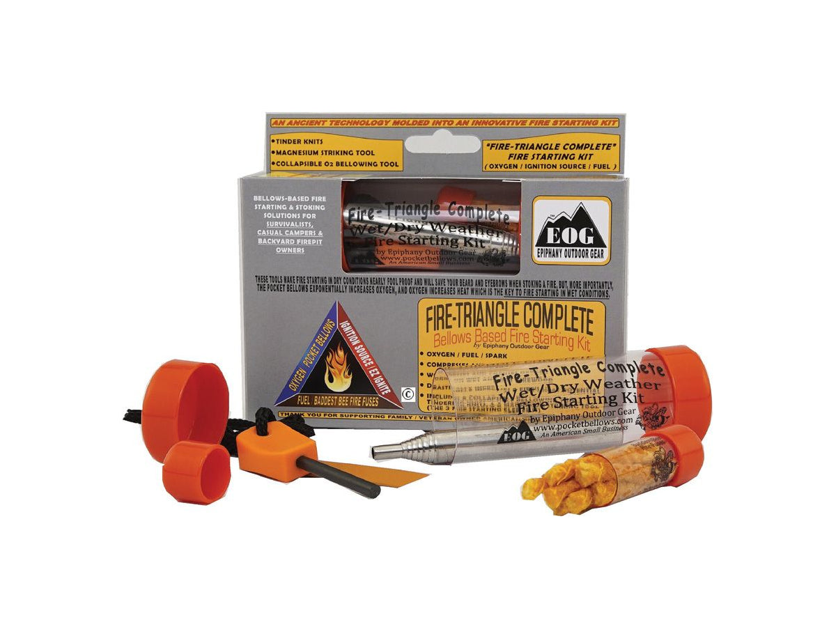 Since fire starting requires 3 elements: an ignition source, fuel, and oxygen. These three requirements are known as "The Fire Triangle". Epiphany Outdoor Gear developed the Pocket Bellows “Fire-Triangle Complete” Wet/Dry Weather 3-Piece Fire Starting Kit around these requirements, and they are the only fire-starting kit makers that effectively provide these requirements in a compact lightweight kit. These tools will give users peace of mind in wet weather conditions and makes fire starting in dry conditions nearly idiot-proof (Please be fire wise and don't be an idiot around fire).