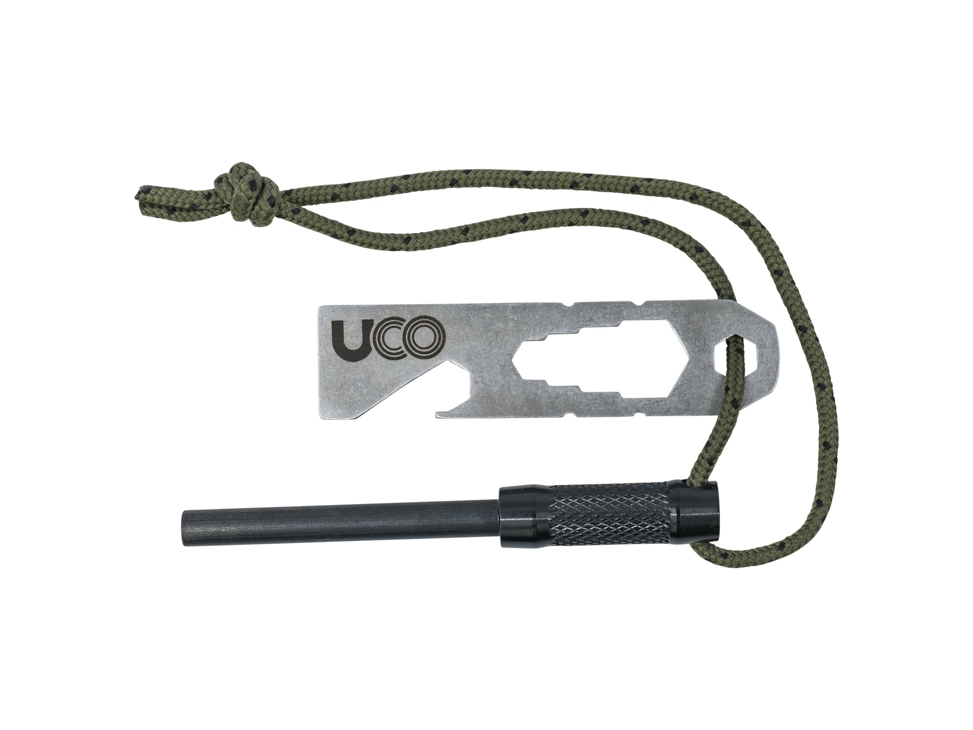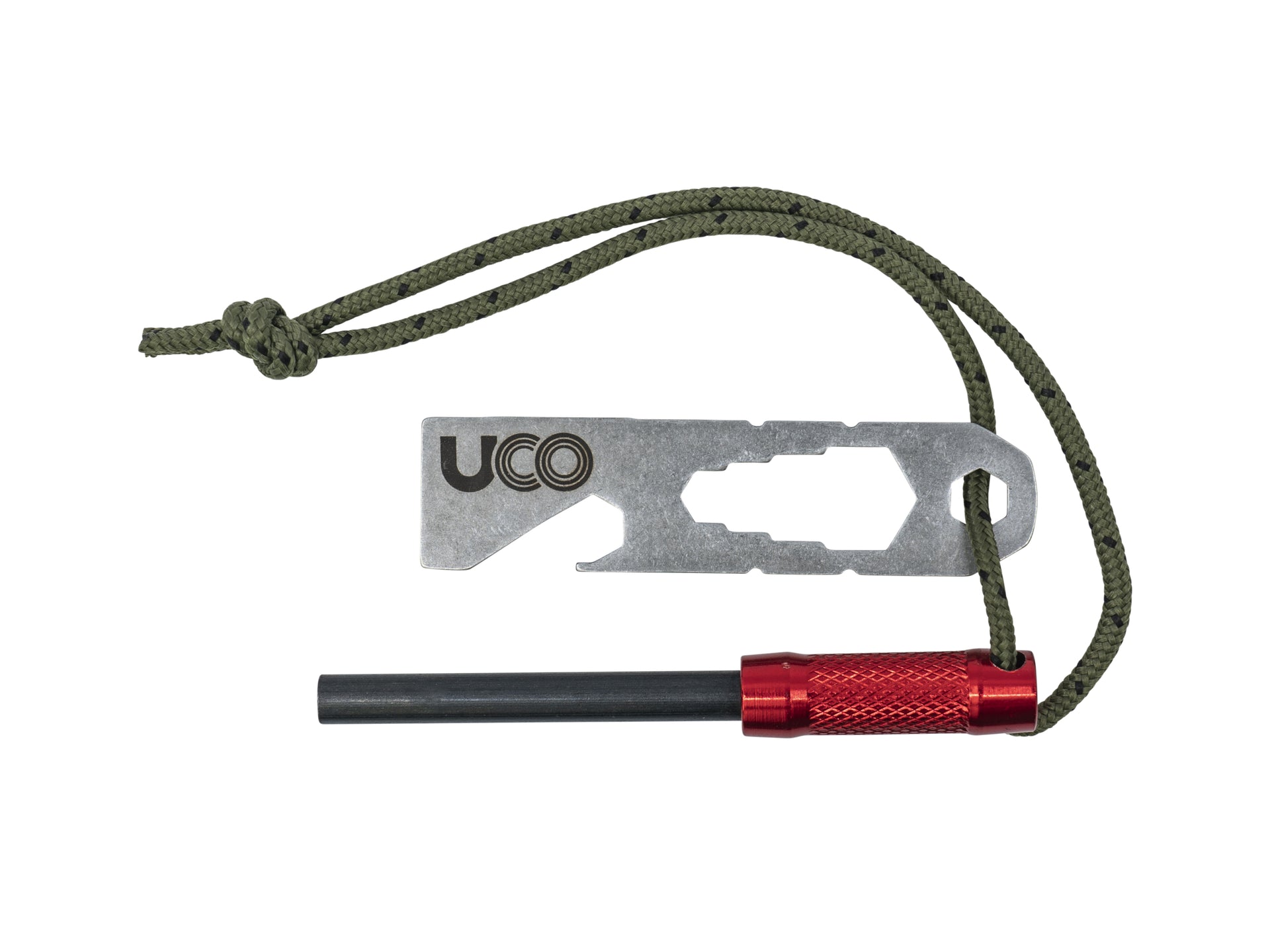Sparks fly when the UCO Survival Fire Striker is used with its stainless steel striker. This fire starter has many uses and can ignite tinder or be used to light a campfire, gas stove or gas barbeque. The robust Ferrocerium rod is capable of 3,000 strikes (at 5400 degrees F) in all conditions (at all altitudes and in cold weather). It also comes with a stainless steel striker which also is a multifunctional survival tool with 8 functions. Functions include screwdriver, bottle opener, 4 hex sizes and striker. Finally it's all held together with a Paracord lanyard connected to both pieces.