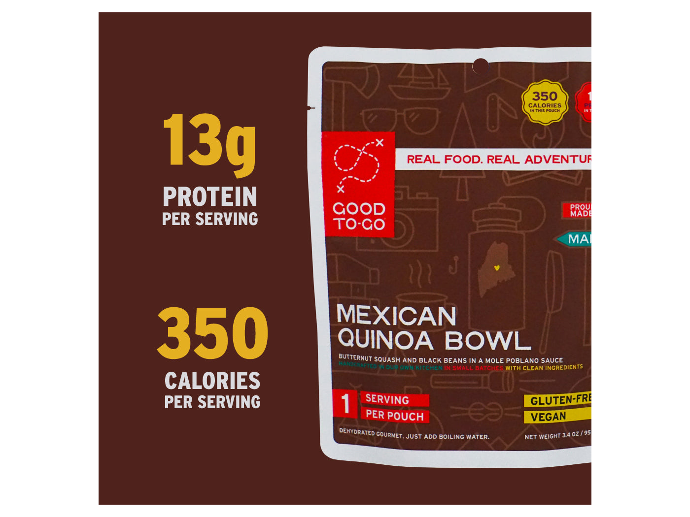 Quinoa, Dried Black Beans, Winter Squash, Corn, Onion, Dried Butternut Squash, Dried Tomato Flakes, Poblano Pepper, Agave, Grapeseed Oil, Garlic, Cacao Powder, Sesame Seeds, Sea Salt, Cumin, Cinnamon, Ancho Chili Powder, Coriander, Fennel Seed, Dried Scallion, Dried Cilantro, Mexican Oregano