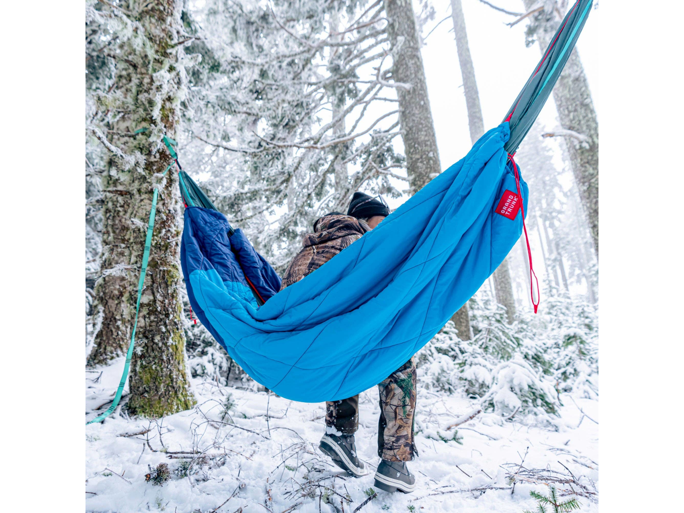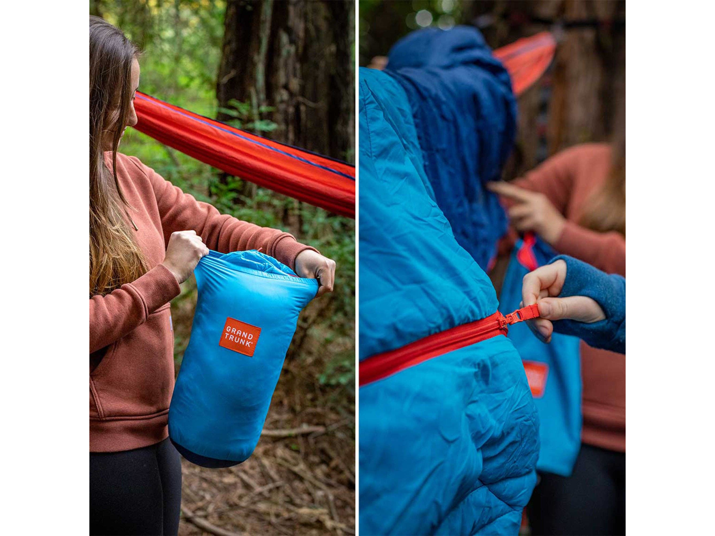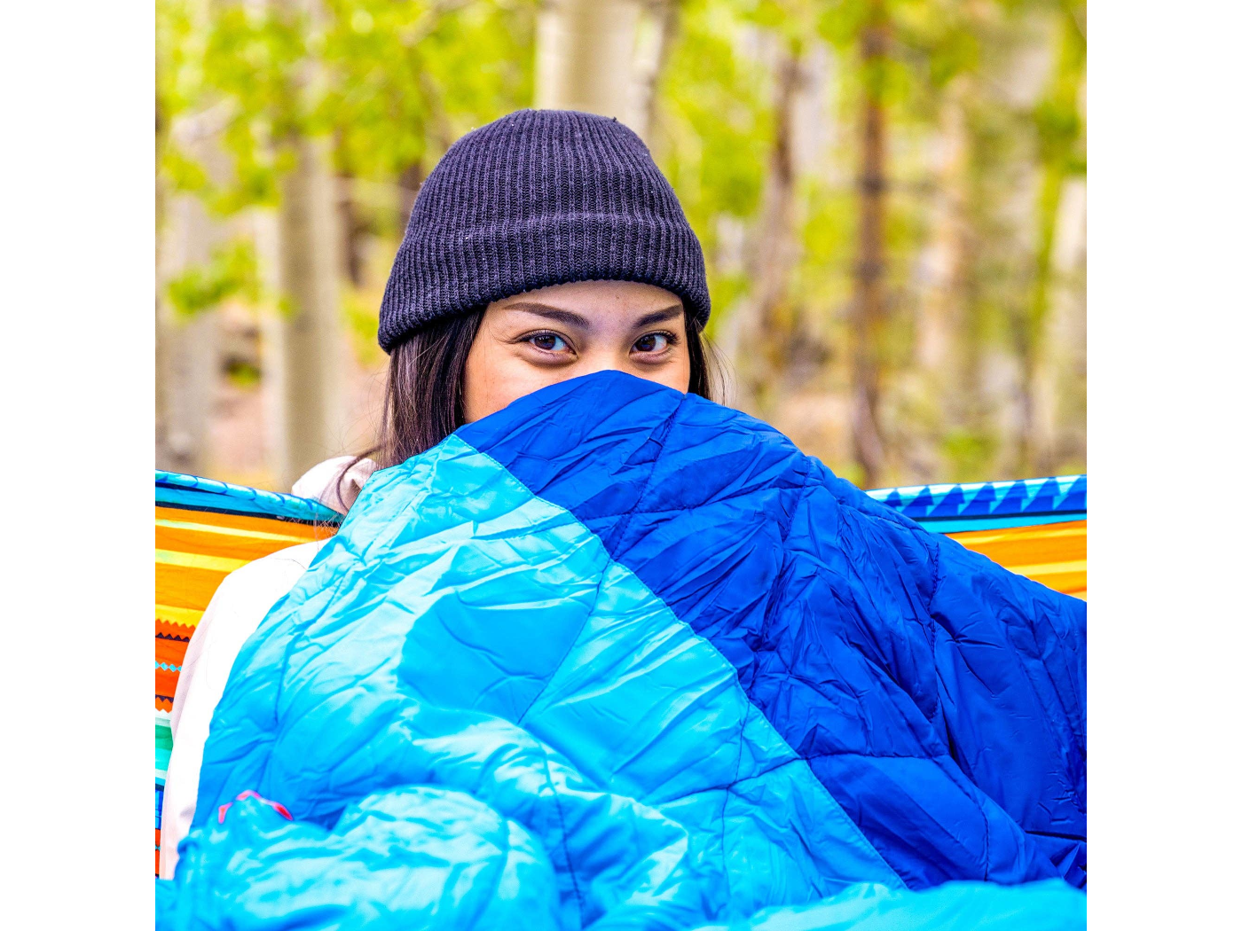 Don’t let cool weather keep you inside when you can turn your hammock into a warm, cozy cocoon with our versatile hammock underquilt and overquilt. The Grand Trunk 360° ThermaQuilt completely wraps around any hammock and cinches at the ends to keep the warm air in and cold air out. Or lay it flat to use as a tech blanket or traditional sleeping bag. Our underquilt works with almost any camping, outdoor or backyard hammock. Zip into warmth and stretch out underneath the stars; you’ll be well-rested for the new day’s journey! The Thermaquilt is a summer rated sleeping bag for cool summer night