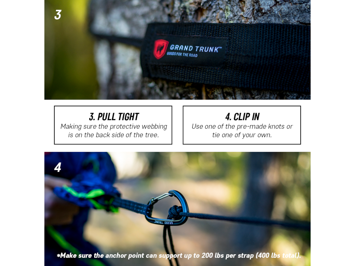 The only thing stopping you from your next adventure is you. Close your laptop, put down the remote, grab your keys, and get out there. With GrandTrunk's hammock tree straps, you can sit back and take in the view anywhere you want. Our hammock hanging suspension straps have 36 adjustment points (18 on each side), which will allow you to make micro hammock adjustments, giving you the perfect hang. Each strap is 10' long, giving you 20' in total to work with. Our hammock suspension straps use super strong 1" webbing and work with almost any hammock. Just insert a carabiner or hook into one of the 18 adjustment points and you'll be hanging in no time.