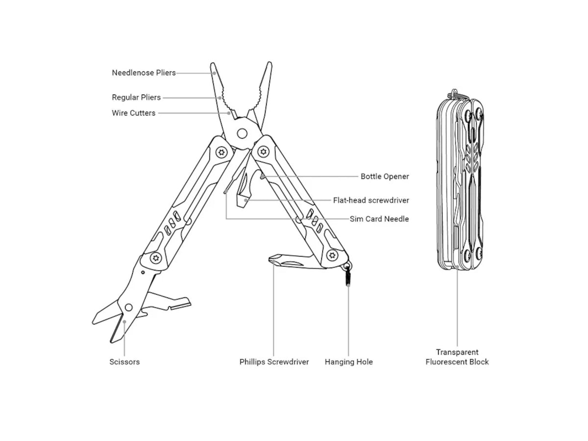 Tools Include: Needle Nose Plier, Regular Plier, Mini Wire Plier, Scissors, Phillips Screwdriver, Flathead Screwdriver, Sim Card Needle