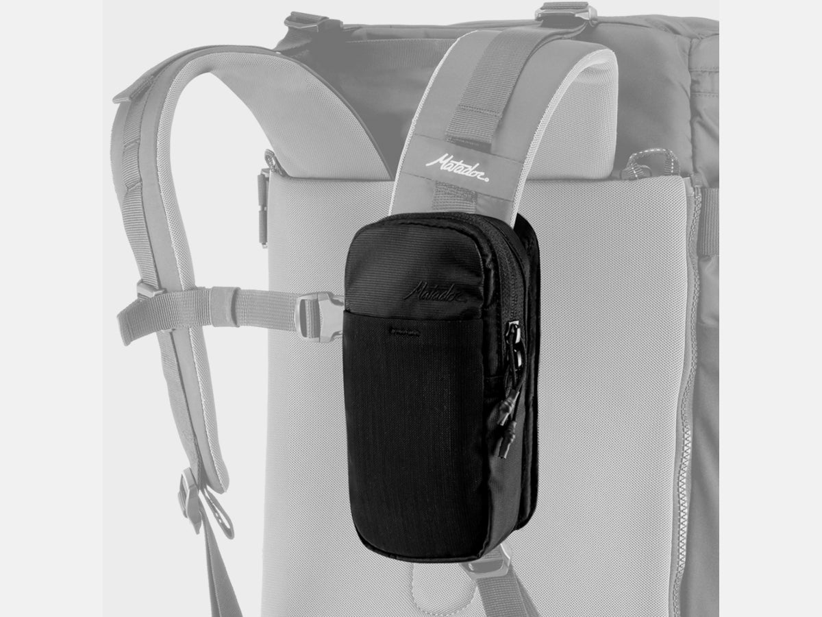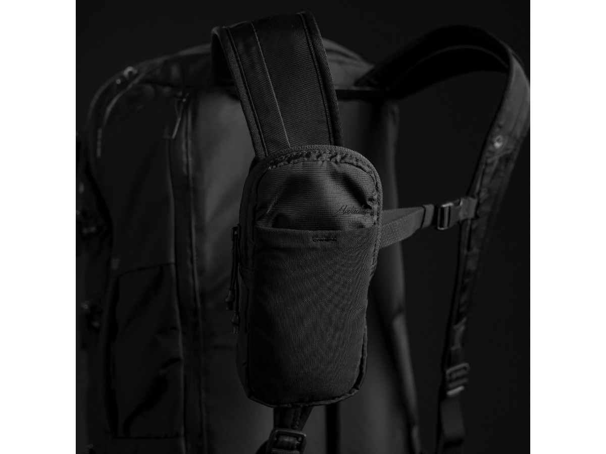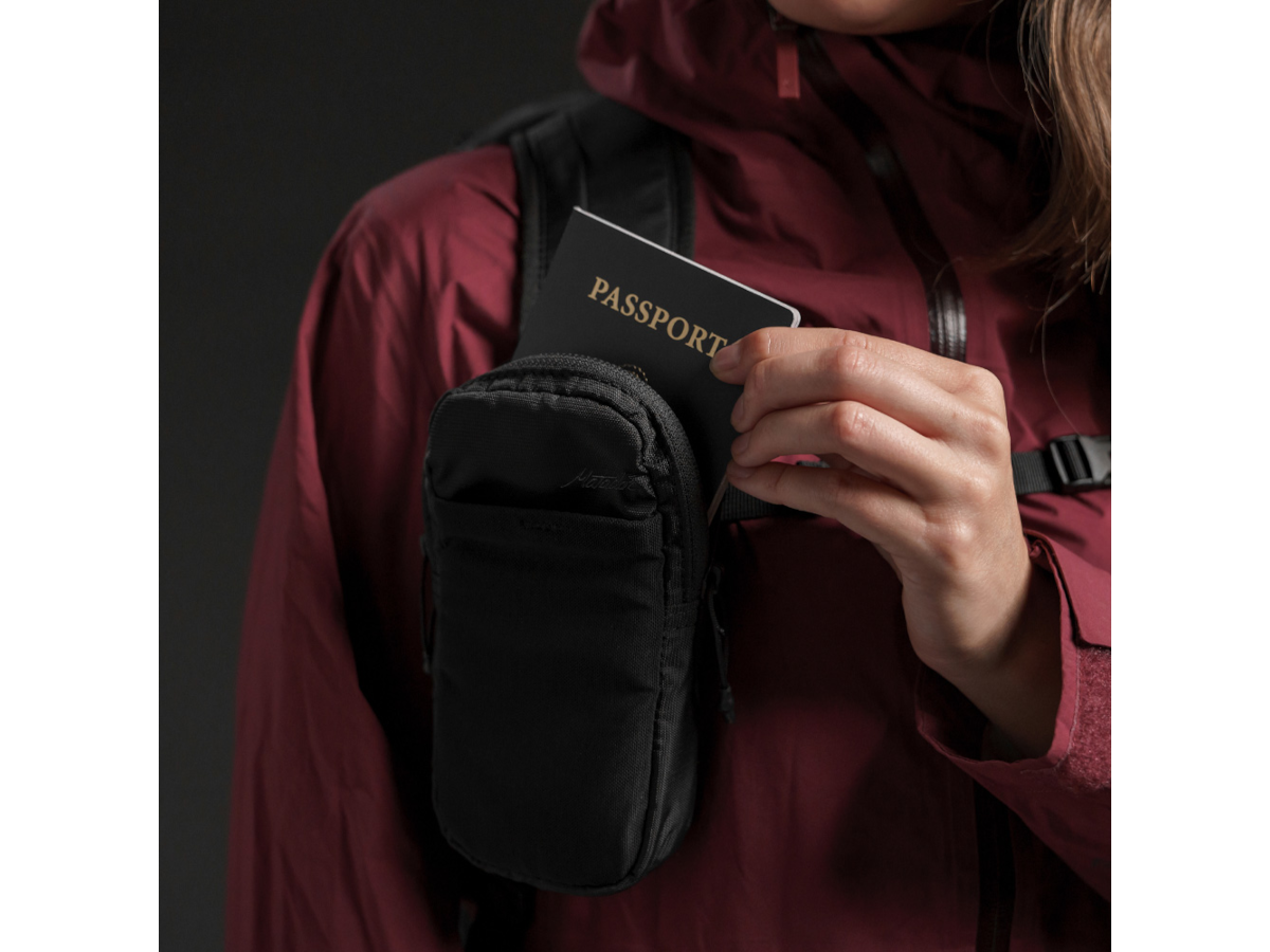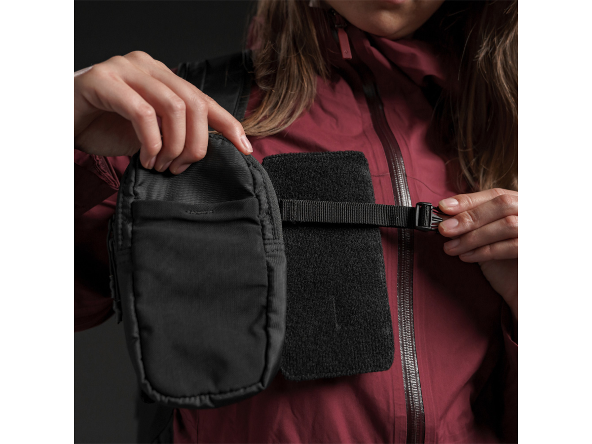 The Speed Stash firmly attaches to the front of your backpack shoulder strap (any brand) for quick access to your phone, passport, wallet, snacks, or other small essentials.