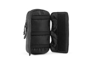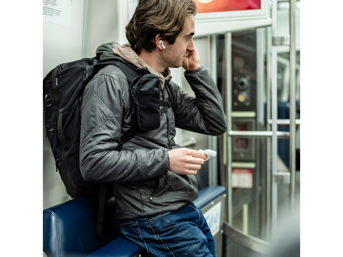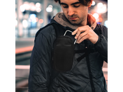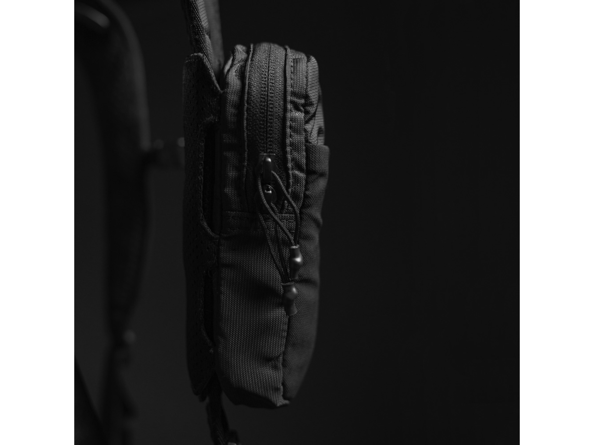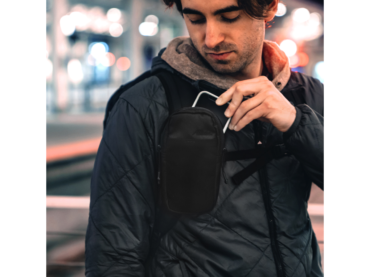 The Speed Stash firmly attaches to the front of your backpack shoulder strap (any brand) for quick access to your phone, passport, wallet, snacks, or other small essentials.