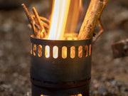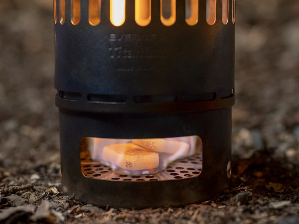The “TITANIUM DX STAND” serves a dual purpose as both a wind guard and a trivet. When equipped with a “power plate” at its base, it conveniently accommodates the use of both solid fuel and twigs for versatile outdoor cooking.