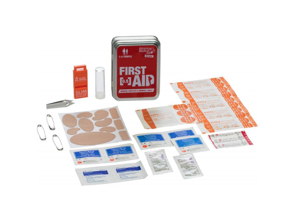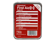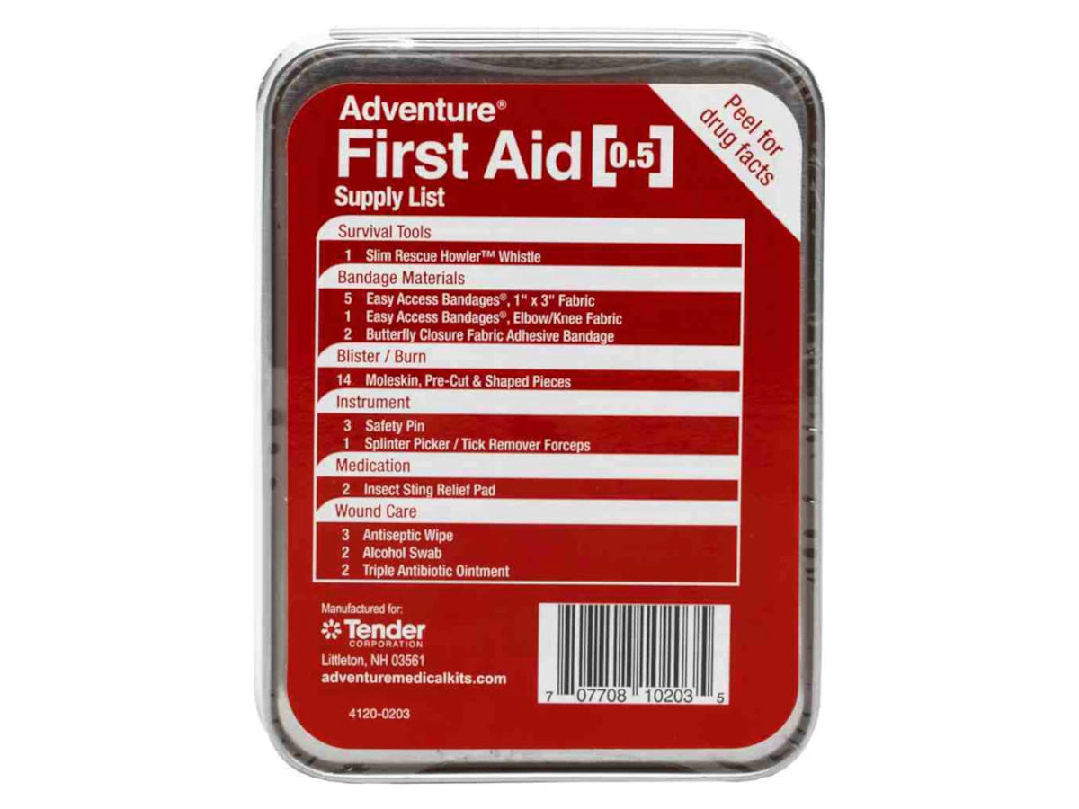 The Adventure First Aid 0.5 kit contains basic first aid necessities in a portable, stylize, hinged-lid tin case. Kit is designed for 1-2 people.