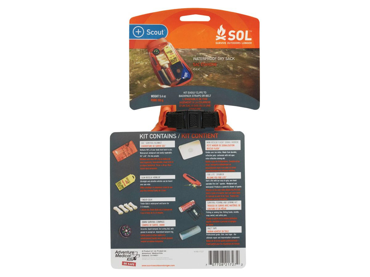 The watertight SOL Scout survival kit has the survival tools that mean the difference between life and death in an emergency. Essentials for shelter, fire starting, signaling, navigation, gear repair, and more are housed in a roll-top watertight bag that will protect the tools in all conditions.