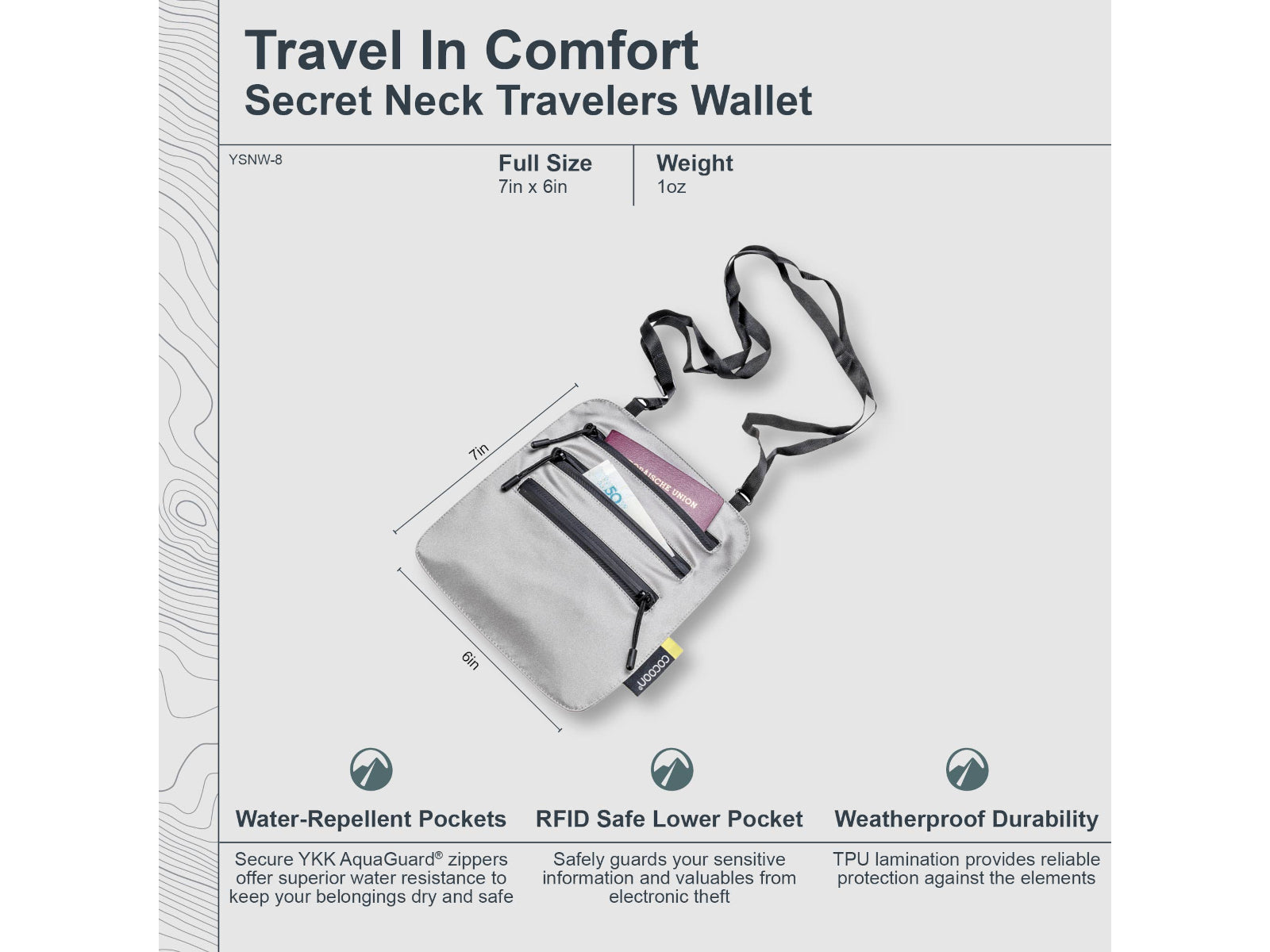 Worried about keeping your valuables safe and dry during travel or outdoor activities? Discover the ultimate solution with our Secret Neck Wallet. Experience peace of mind on your adventures. Our Secret Neck Wallet is crafted from Monsoon Silk™ material, a premium blend of 100% silk with an inside TPU-lamination, ensuring water resistance and durability. Perfect for travel and outdoor activities, this wallet keeps your essentials secure and dry, no matter where your journey takes you. Stay organized and protected. Featuring a zippered compartment, the Secret Neck Wallet is designed to hold your passport, credit cards, cash, and other small items. The adjustable strap ensures a comfortable and secure fit, while the slim design prevents bulkiness, allowing you to wear it discreetly under your clothing. With an RFID secure front pocket and two pockets with YKK AquaGuard® water repellent zippers, your personal information and valuables remain safe from theft and the elements.