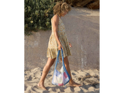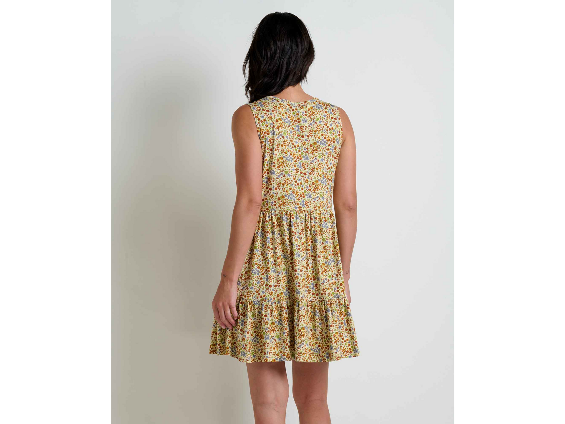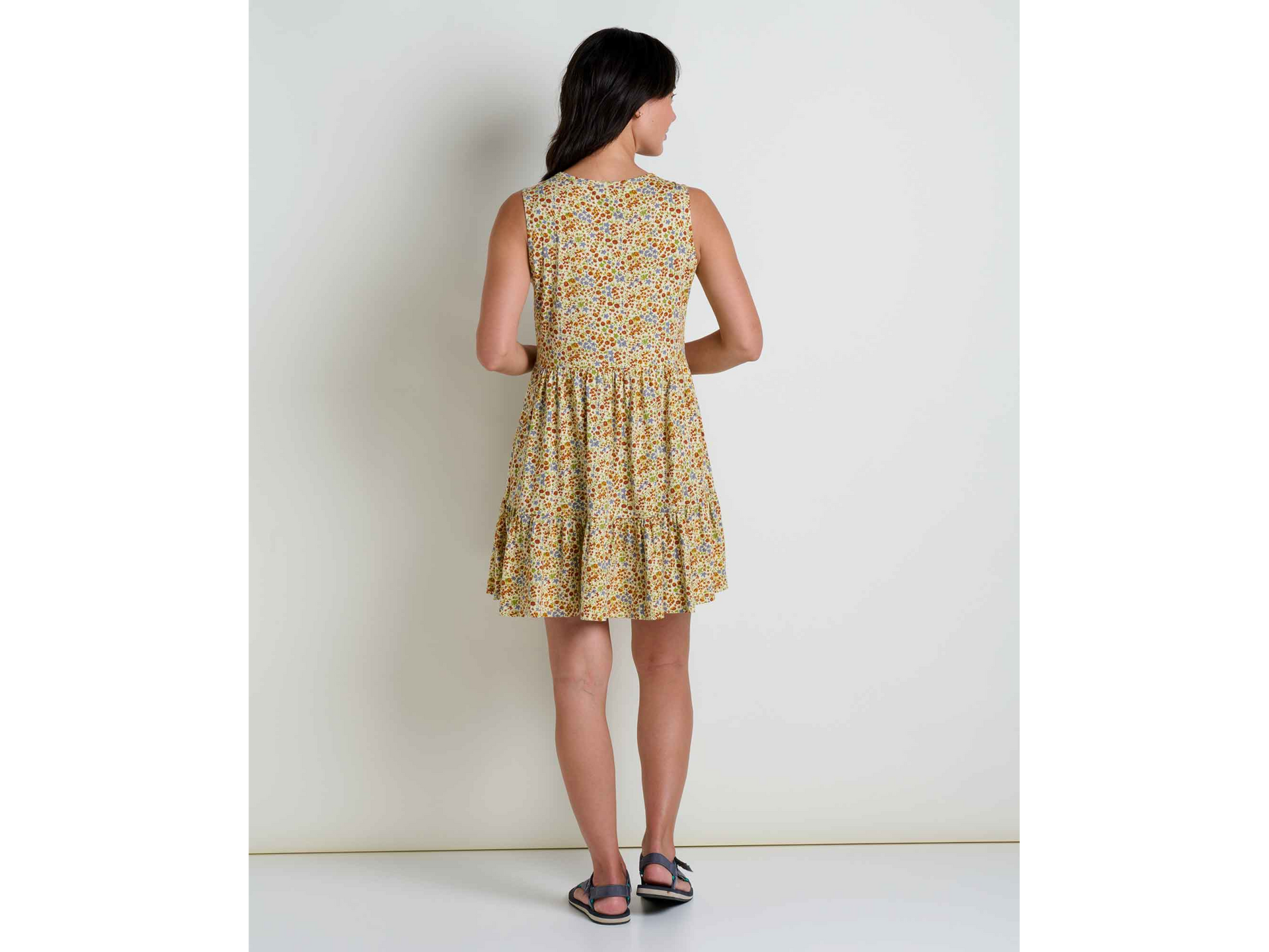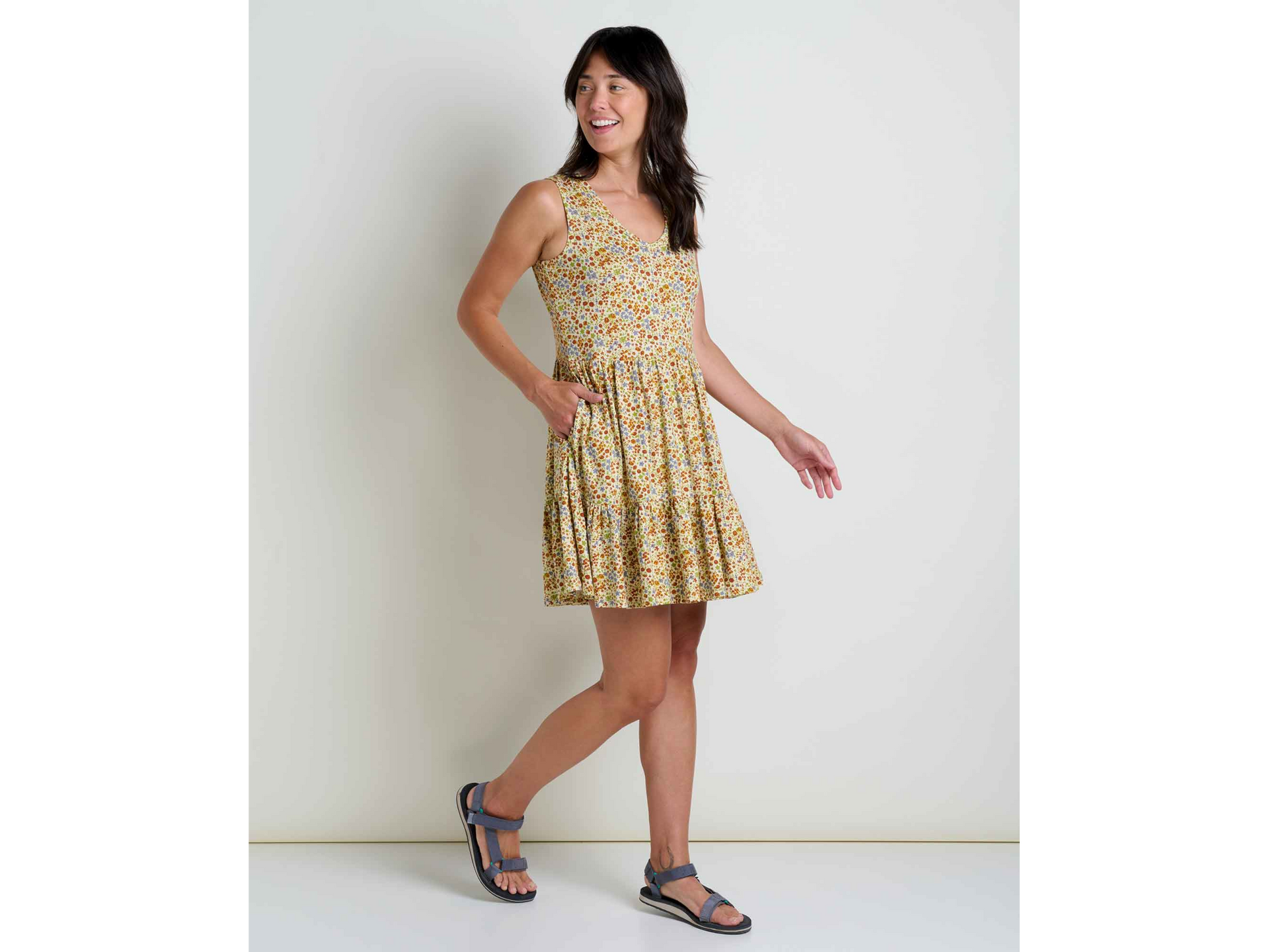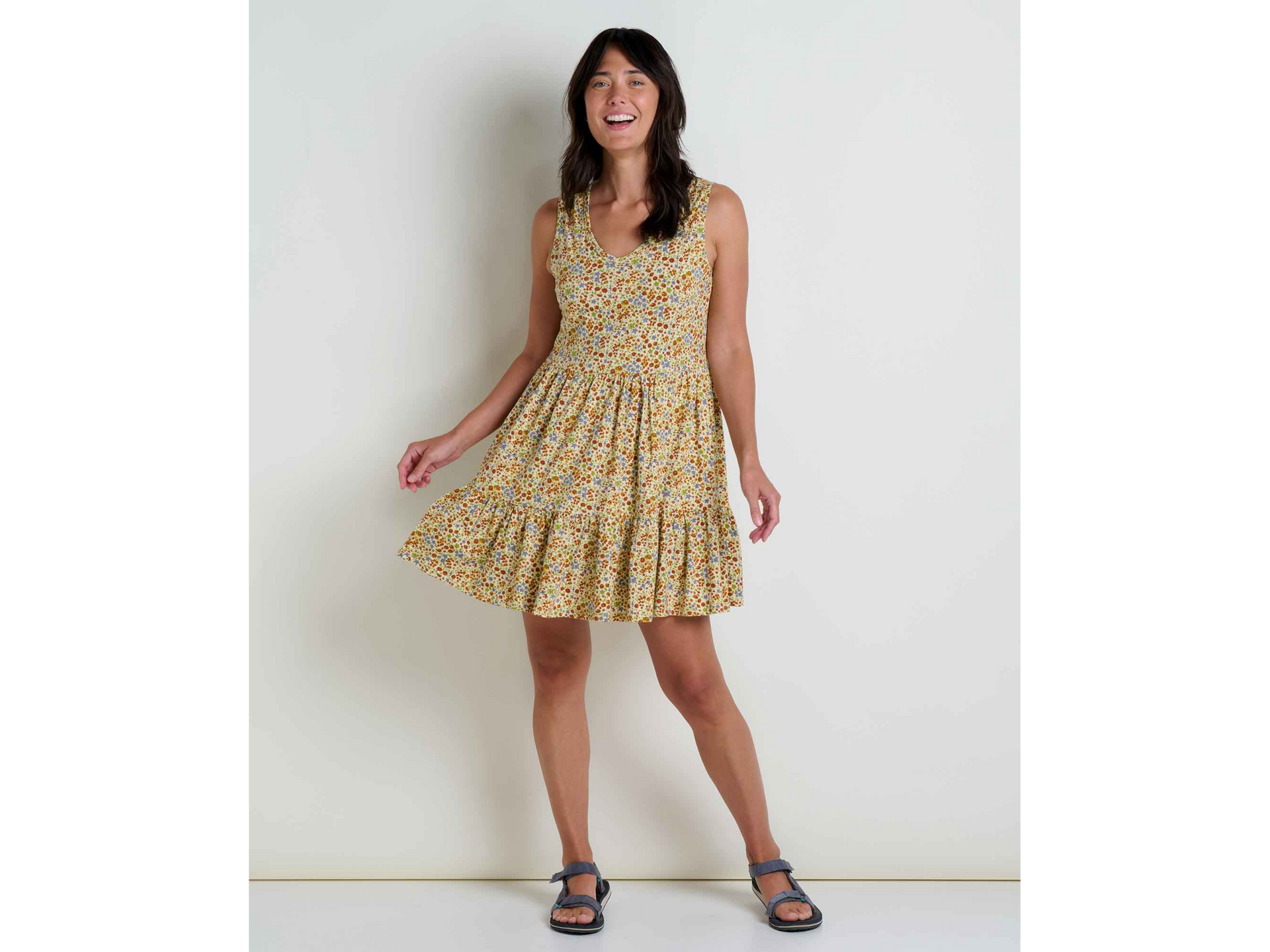 Fit: Swing silhouette, v-neck, bra-friendly straps, tiered skirt, hits above the knee, 35 inch length